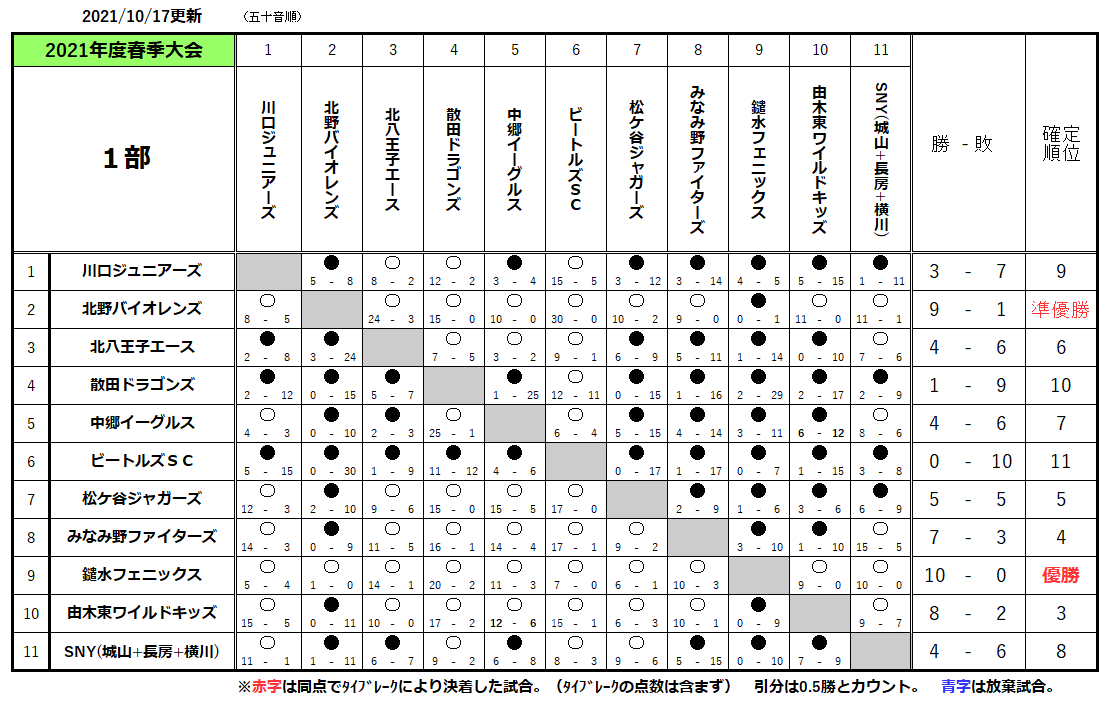| 勝敗同数の場合は直接対決の勝者を上位とする。